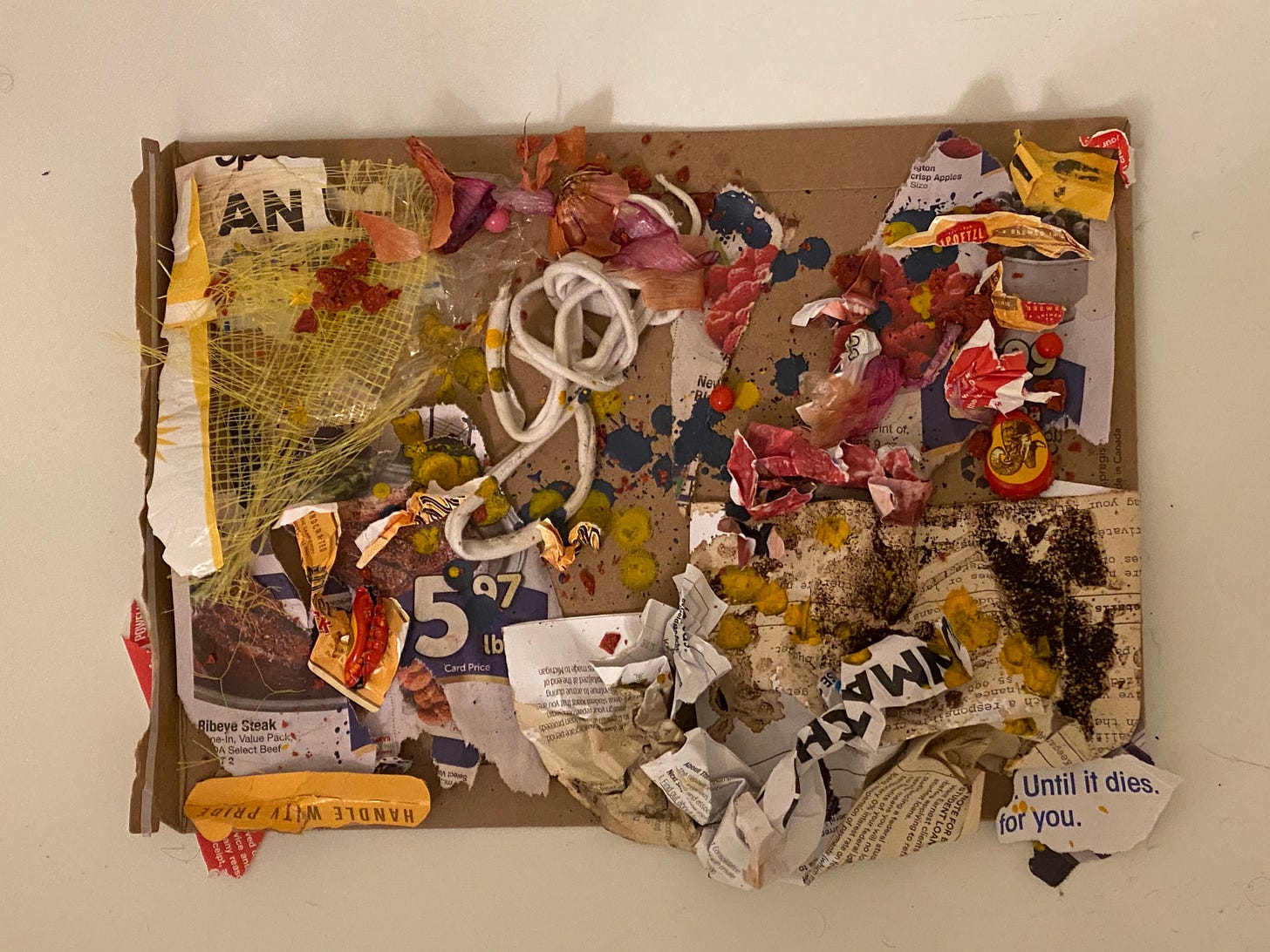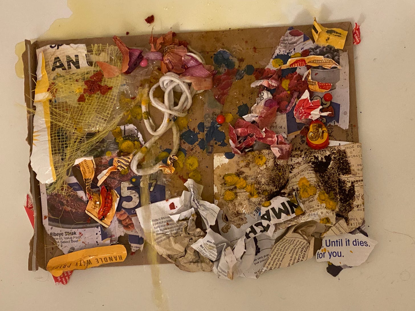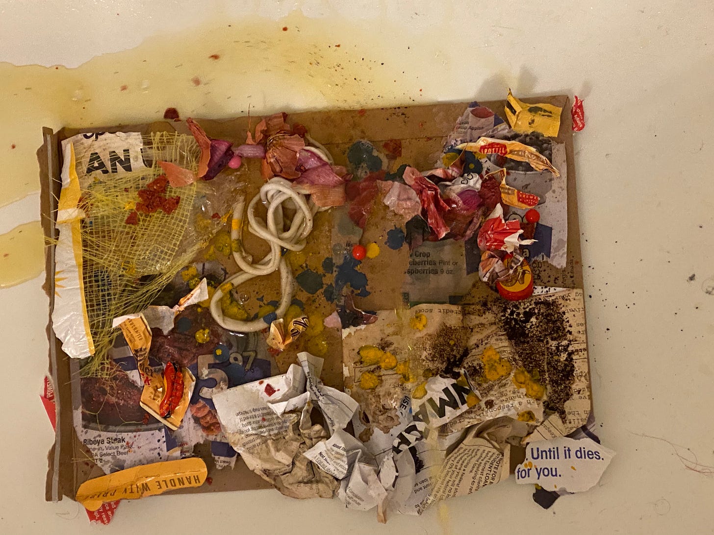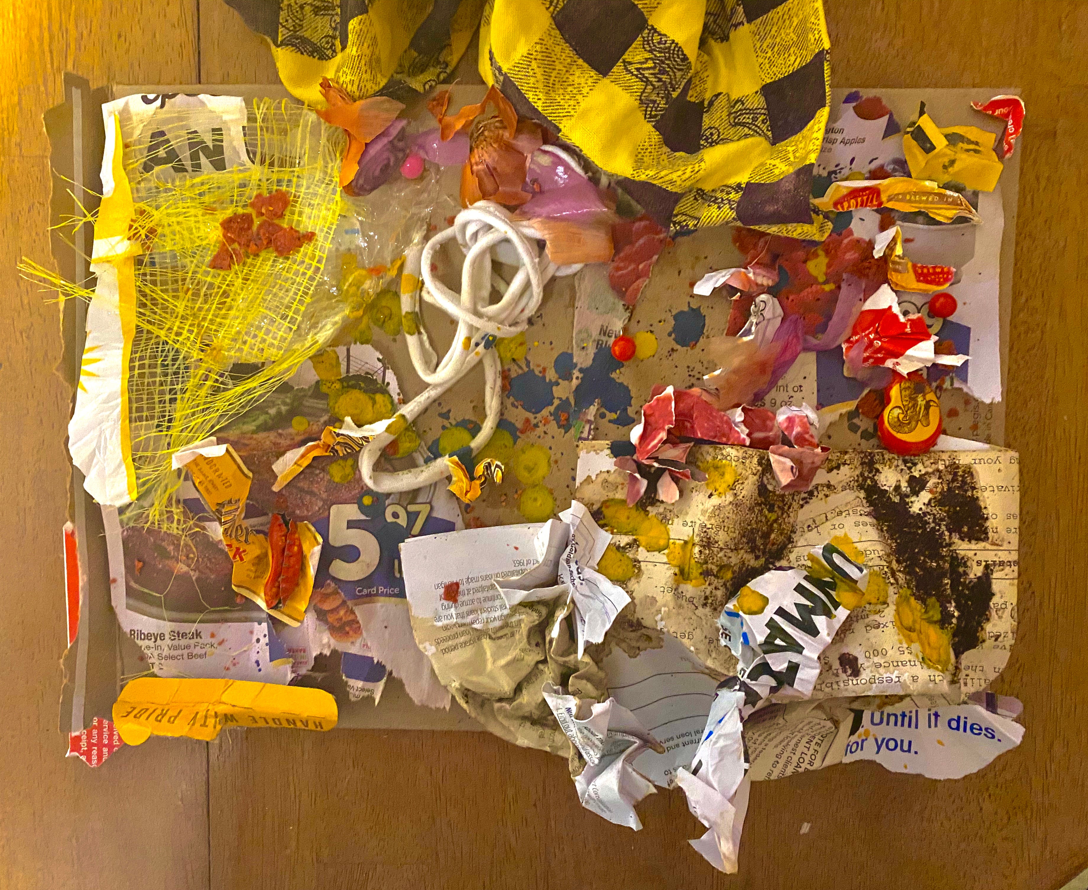 breathe in. you are going to accept what you are doing for what it is: you are playing with trash. you are not reclaiming discarded items. you are not reinterpreting waste. you are not redefining what is and what isn’t refuse. you are playing with trash. you are simply playing with trash. breathe out and say that word: trash. trash. trash. let the word fill your nose, just like the stench from sunday dinner scraps still sitting in the bin: weeping onion ends, muscle bits grown smeary, mixed berry clot-colored slurry. trash trash trash. we are playing with trash. you are playing with trash. we are playing with trash.