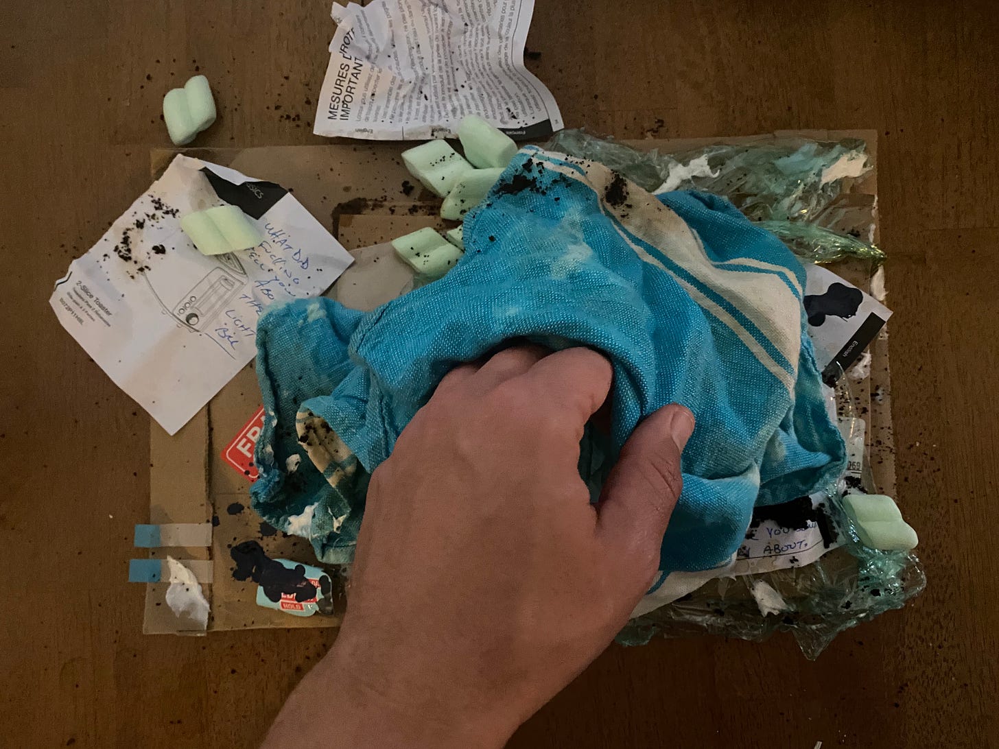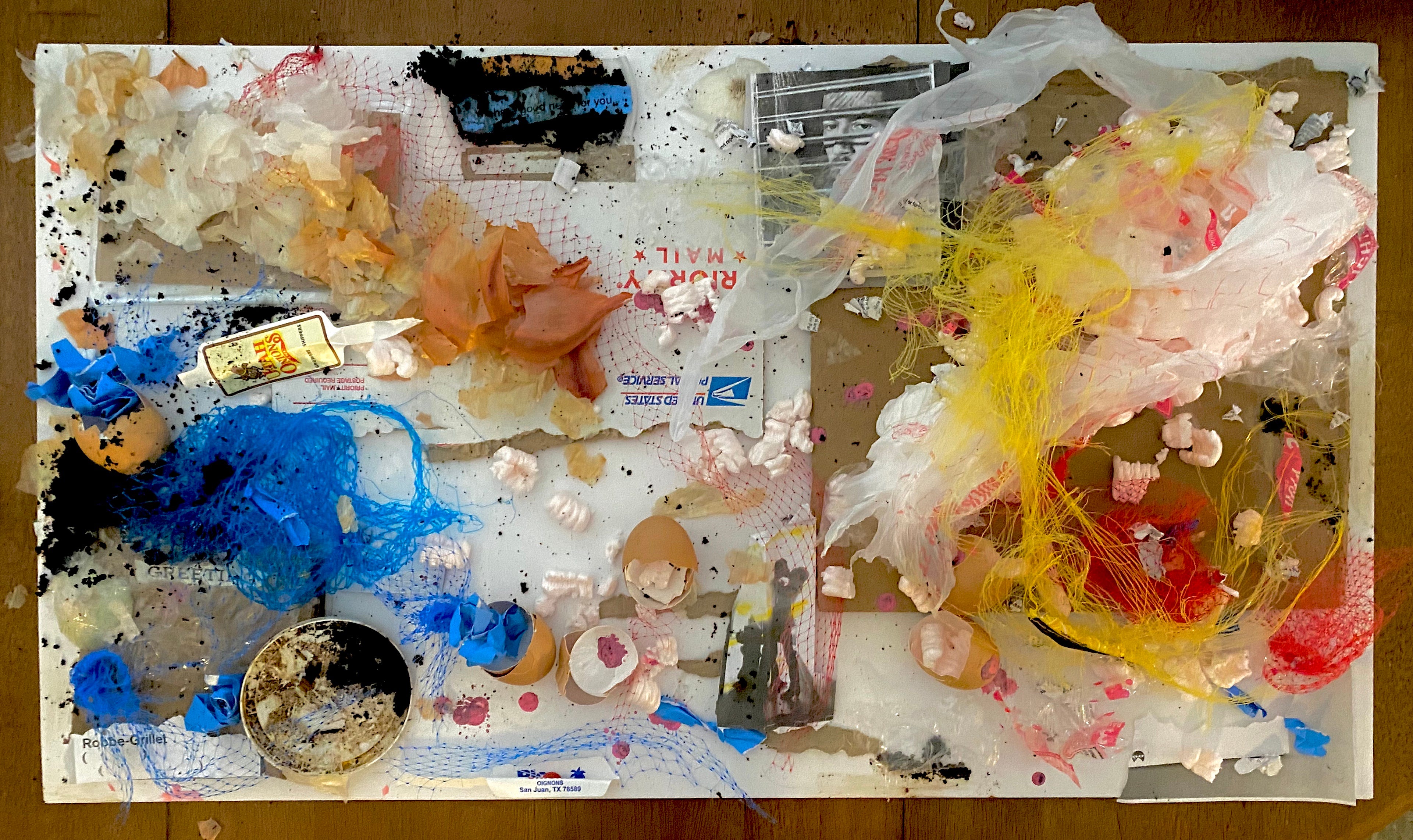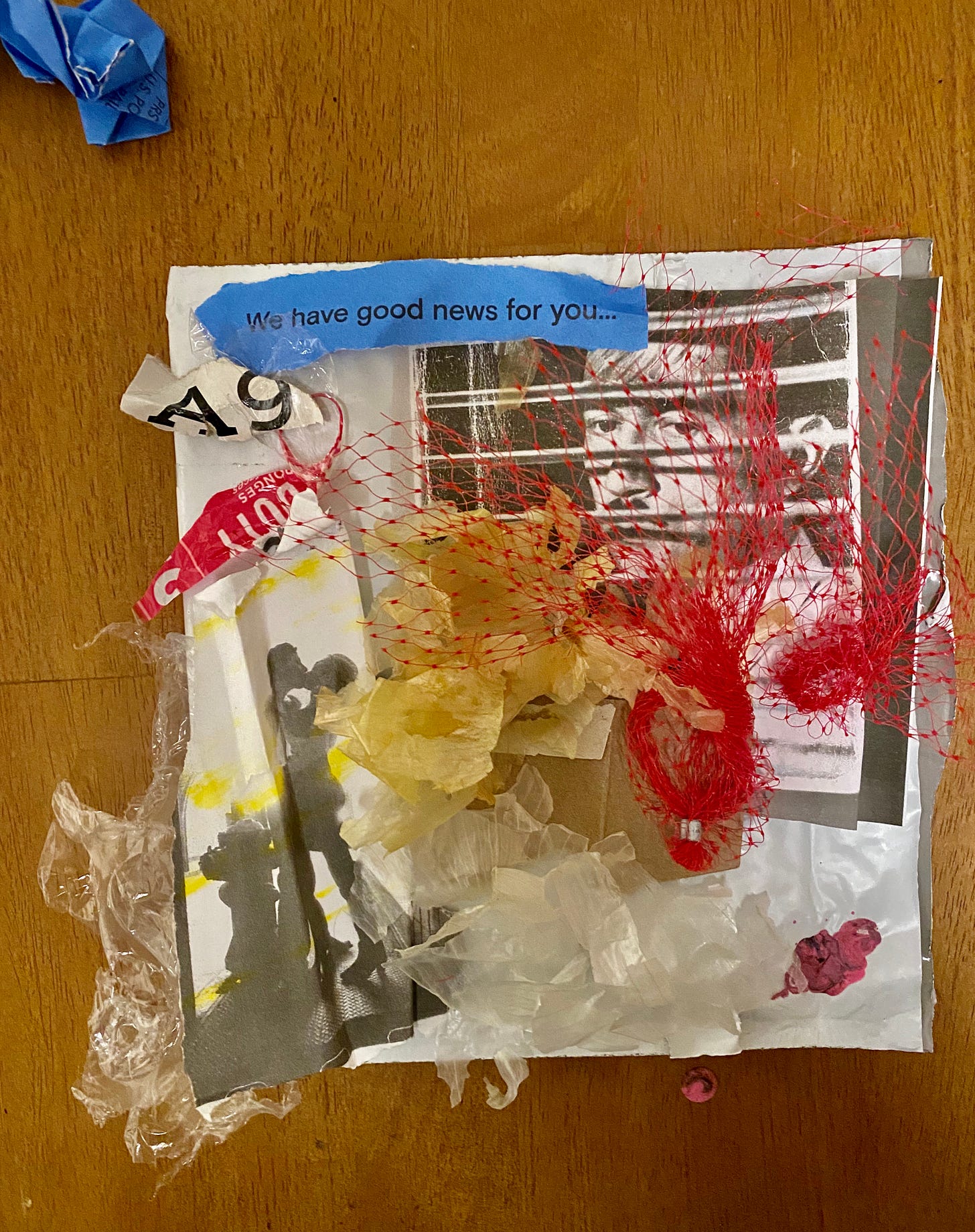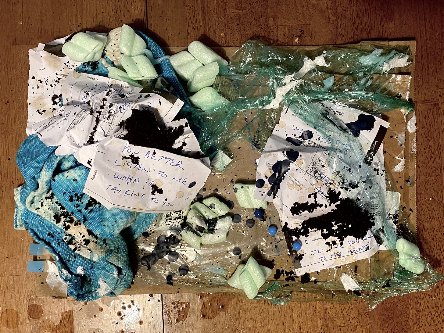 breathe in. you are going to accept what you are doing for what it is: you are playing with trash. you are not reclaiming discarded items. you are not reinterpreting waste. you are not redefining what is and what isn’t refuse. you are playing with trash. you are simply playing with trash. breathe out and say that word: trash. trash. trash. let the word fill your nose, just like the stench from sunday dinner scraps still sitting in the bin: weeping onion ends, muscle bits grown smeary, mixed berry clot-colored slurry. trash trash trash. we are playing with trash. you are playing with trash. we are playing with trash.