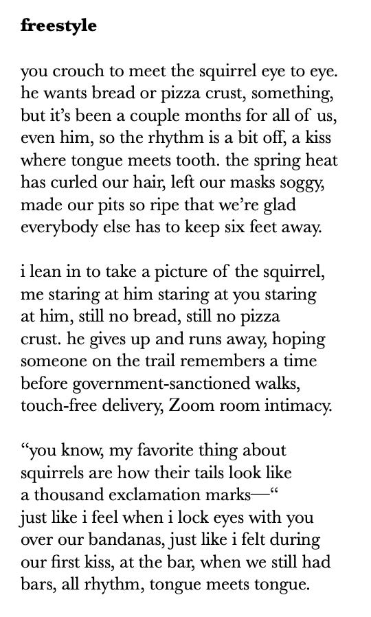 breathe in and think about the end of the world. let out a laugh. what is the end of the world? who is at the end of the world? why is the end of any world never without some historian or journalist or poet or shithead on the other end? who exactly is watching the capybaras roam around an argentine neighborhood? who is marveling at the restored color of venice’s canals? where did you find that retweet of unmasked meemaws at the denny’s banging their fists for jiggly eggs and buttery toast? breathe in and think about the sights and smells of every other end of the world: the vaporized flesh from the atomic bombs; the distended bellies of yemeni famine; the pieces of a bride after a drone strike; the first achoo from pizarro’s horsemen; the charred bones in tulsa and rosewood; every kaposi sarcoma lesion. an ending for whom? an ending is a decision to say it is an end. an end for whom? an end is a choice to say the story is a story and the story is to be ended. ended by whom. who destroys. breathe out and think about what you will have done to be at the next end of the world.